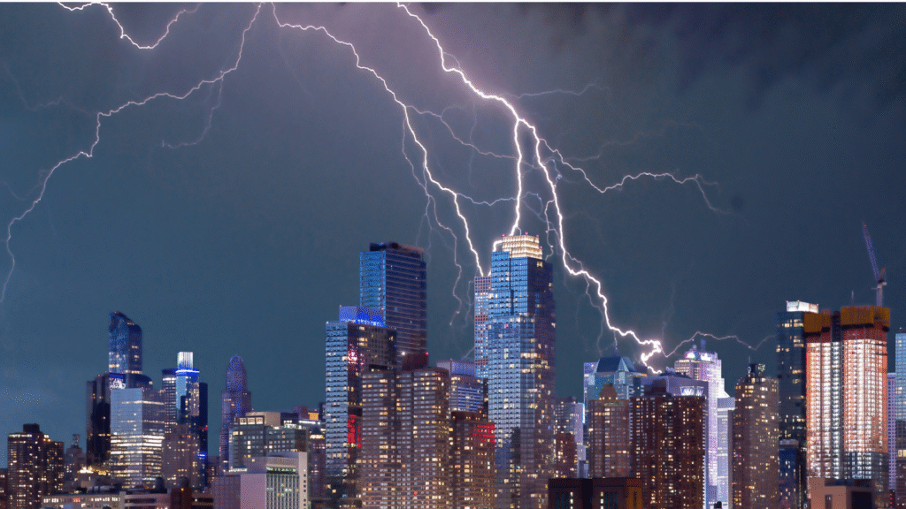 Lightning forms when the electric field between cloud and ground crosses a critical threshold. Euthalia’s system—using Air Heads, filters, and field stabilizers—continuously conditions the local electromagnetic environment to keep the field below that threshold in the protected volume. Result: a dramatic drop in the probability of a lightning leader forming nearby.